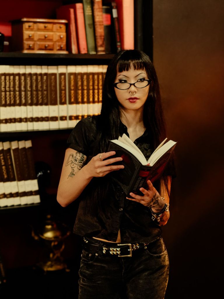 Portraits of Carmen, taken at Beyond Boundaries during Don’s Photo 3rd Annual Pride Portrait Session, capturing her in moments of thoughtful reading and repose within a richly decorated, dimly lit space.