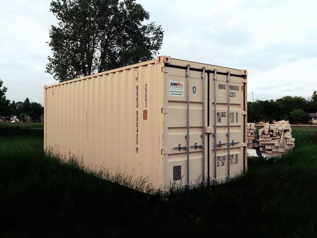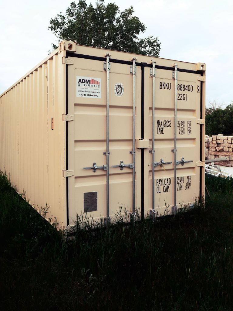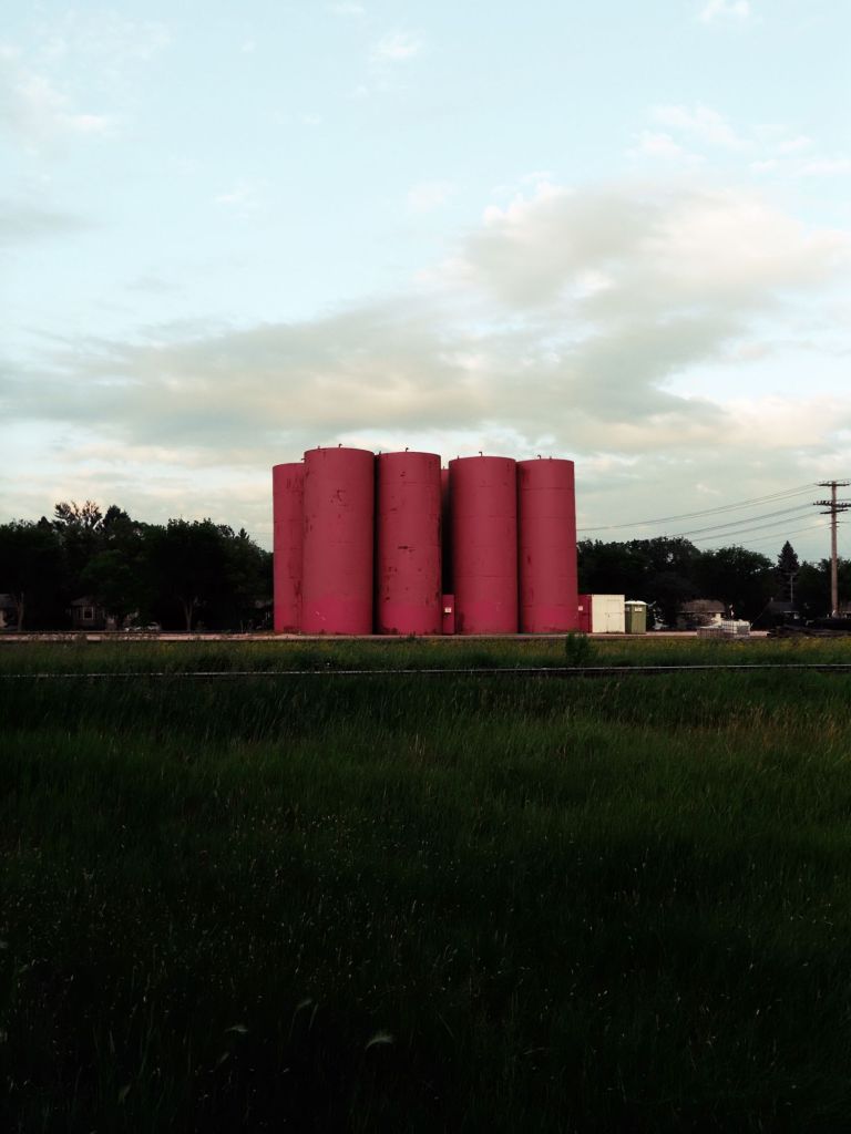 Stumbled across this row of bold red silos standing tall against the prairie sky — and this creamy beige ADM storage container tucked beside a stack of stone like it owns the place.