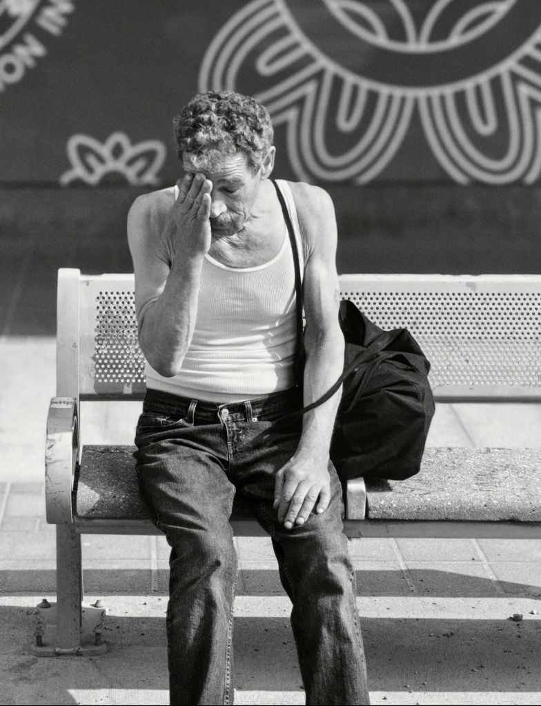 This moment says it all — tired eyes, worn hands, and a bench that holds the weight of it all.
