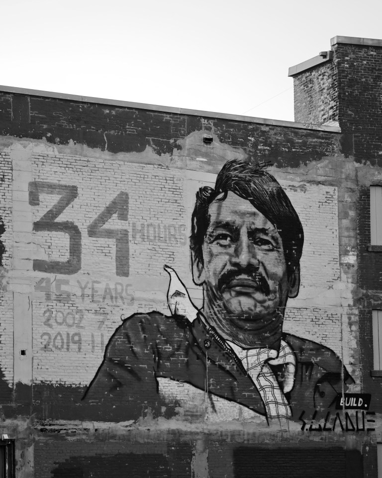 This mural honors Brian Sinclair, an Indigenous man whose life was cut short in a Winnipeg hospital emergency room in 2008 after waiting an unimaginable 34 hours for care. The poignant text “34 HOURS” and “45 YEARS” starkly highlight the length of his wait and his age at the time of his passing.