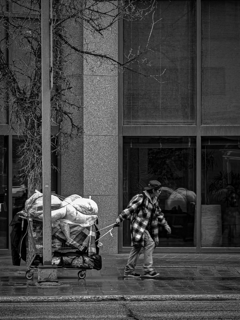 Rainy reflections and the weight of the world. An individual moves through the wet urban landscape, pulling a cart that seems to hold everything they own. It’s a reminder of the diverse experiences that unfold within our city.